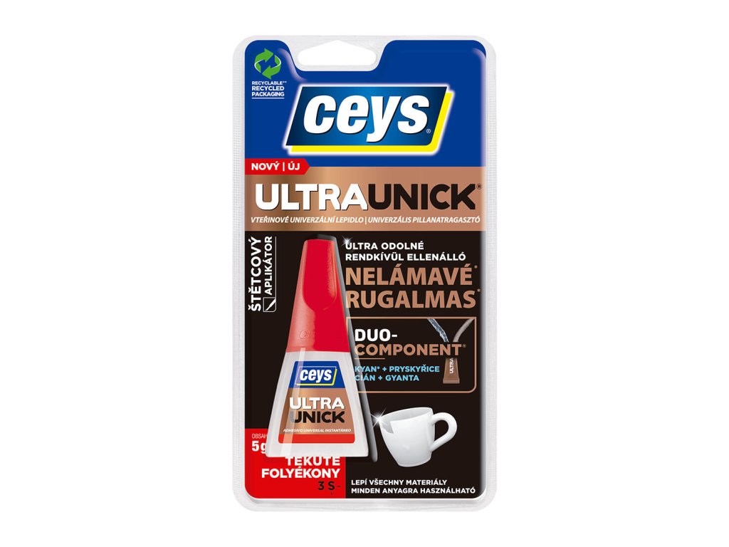 Lepidlo vteřinové 5 g ULTRAUNICK, se štětcem. hmotnost: 5 g CEYS UltraUnick 5 g, navíc se štětečkem pro snadnější aplikaci. Nelámavé tekuté vteřinové lepidlo. Díky dvousložkové technologii kombinuje sílu kyanoakrylátu s pružností pryskyřice, a tím zajišťuje přizpůsobení spoje.Doplňkové parametry