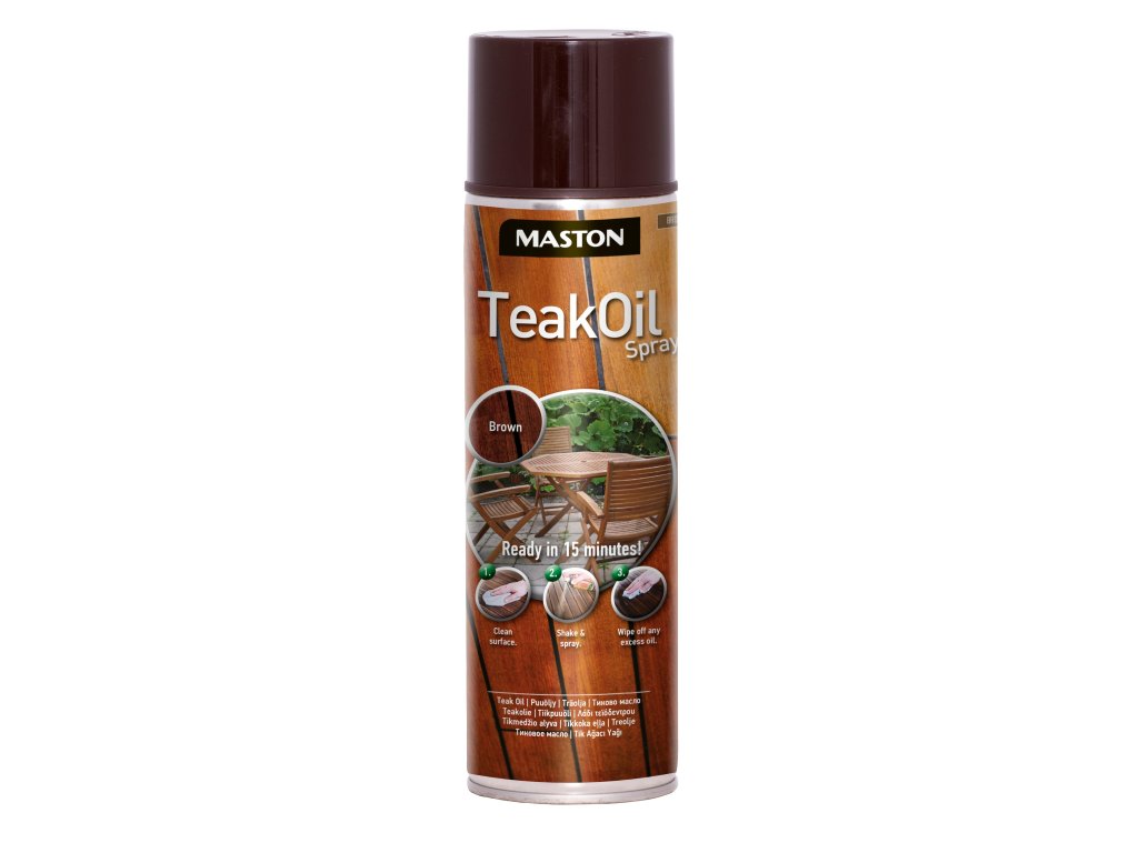 Snadno použitelný ochranný a ošetřující prostředek na ošetření jakéhokoliv druhu dřeva. Proniká hluboko do dřeva a vytváří ochrannou vrstvu bez filmování na povrchu. Teakový olej posiluje dřevěný povrch a obnovuje jeho přírodní tón. Zabezpečuje odolnost vůči měnícím se klimatickým podmínkám a chrání efektivně proti vlhkosti, suchu, ohybu a třepení.Maston TEAK OIL SPRAY je snadno použitelný ochranný a ošetřující prostředek na ošetření jakéhokoliv druhu dřeva. Tradiční a staromódní vzorec varu lněného oleje na dlouhou dobu dává produktu Teak Oil spray jedinečnou schopnost proniknout hluboko do dřeva a vytvářet ochrannou vrstvu bez filmování na povrchu. Teakový olej posiluje dřevěný povrch a obnovuje jeho přírodní tón. Zabezpečuje odolnost vůči měnícím se klimatickým podmínkám a chrání efektivně proti vlhkosti, suchu, ohybu a třepení. Krátká doba schnutí dělá produkt ideálním na ochranu vnějších předmětů, např. jako dřevěné terasy, dřevěné zábradlí a zahradní nábytek.