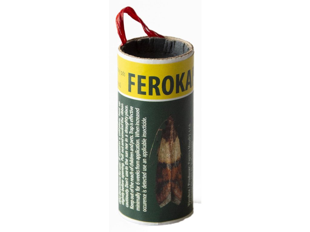 Mololapka FEROKAP. Oboustranný lepový pás papíru opatřený feromonem, který zaručuje účinný odchyt 4 druhů samců potravinových molů - zavíječe skladištního (Ephestia elutella), moučného (Ephestia kuehniella), datlového (Ephestia cautella) a paprikového (Plodia interpunctella). Navíc výrobek obsahuje i atraktant pro účinný odchyt mouchy domácí (Musca domestica).Doplňkové parametry