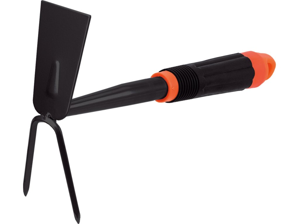 Hranatá dvojhrotá motyka s kovovou pracovní částí. Masivní plastová rukojeť se závitem, který umožňuje našroubování dlouhé kovové násady. Násadu je možné dokoupit a využít pro celou řadu ručního nářadí Stocker (772018).