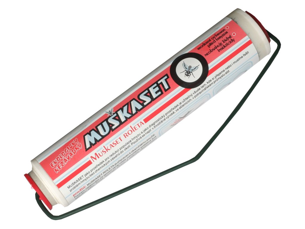 Popis a použití:Muškaset je prostředek pro redukci populace hmyzu a jako diagnostický prostředek je užitečný všude tam, kde si přejeme nebo i musíme řešit problém hmyzu bez chemických zásahů do okolí. Používá se např. v živočišné výrobě, ve sklenících, v potravinářském průmyslu atd. Na speciálním silikonovém podkladu je nanesena vrstva kvalitního nestékavého lepidla. Použité grafické symboly (červené pruhy, zobrazené mouchy) působí atraktivně na cílový hmyz, především na mouchy, komáry, vosy aj. Jediná roleta odchytí až 20 000 much. Výrobek je připraven k okamžitému použití. Pouhým zatáhnutím za spodní okraj rolety odmotáme potřebný kus lepového pásu. Konec je možno stočit do tvaru kapky, tím se zvýší účinnost výrobku. Když se lepová plocha zaplní lapeným hmyzem nebo zapráší do té míry, že je lepová schopnost výrazně snížena, odtrhneme použitý kus rolety a odmotáme další. Jelikož v jednom svitku je 5 bm lepové plochy, vystačí jedna roleta na 10 až 20 týdnů expozice (podle množství hmyzu a roční doby). Z rolety je též možno odmotat delší kus a zavěsit horizontálně lepovou plochou dolů. Pro dosažení optimálního působení je zapotřebí, aby byly archy zavěšeny ve vzájemné vzdálenosti 3 - 5 m na osvětlených místech.