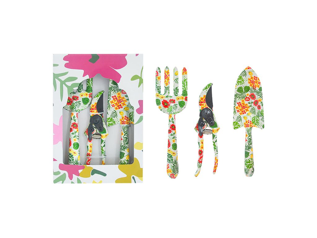 Nářadí zahradní sada 3díl., dekor, železo, Al. sada obsahuje: - 1 ks kypřič půdy (vidlička) 26,5 x 7,6 cm, 125 g, železný, pro kypření, výsadbu a pletí - 1 ks lopatka 28,8 cm 140 g, železá - 1 ks nůžky zahradní 20,5 x 5,5 cm, 165 g, hliníkové - 3dílná sada ručního zahradního nářadí - bílá barva s dekorem růžových květů - zabaleno v dárkové krabičce Stylové ruční nářadí s květinovým motivem, balené v krabičce. Vhodné i jako dárek. Obsahuje malé ruční nářadí pro přesazování rostlinek a nůžky pro zastřihnutí rostlin.Doplňkové parametry