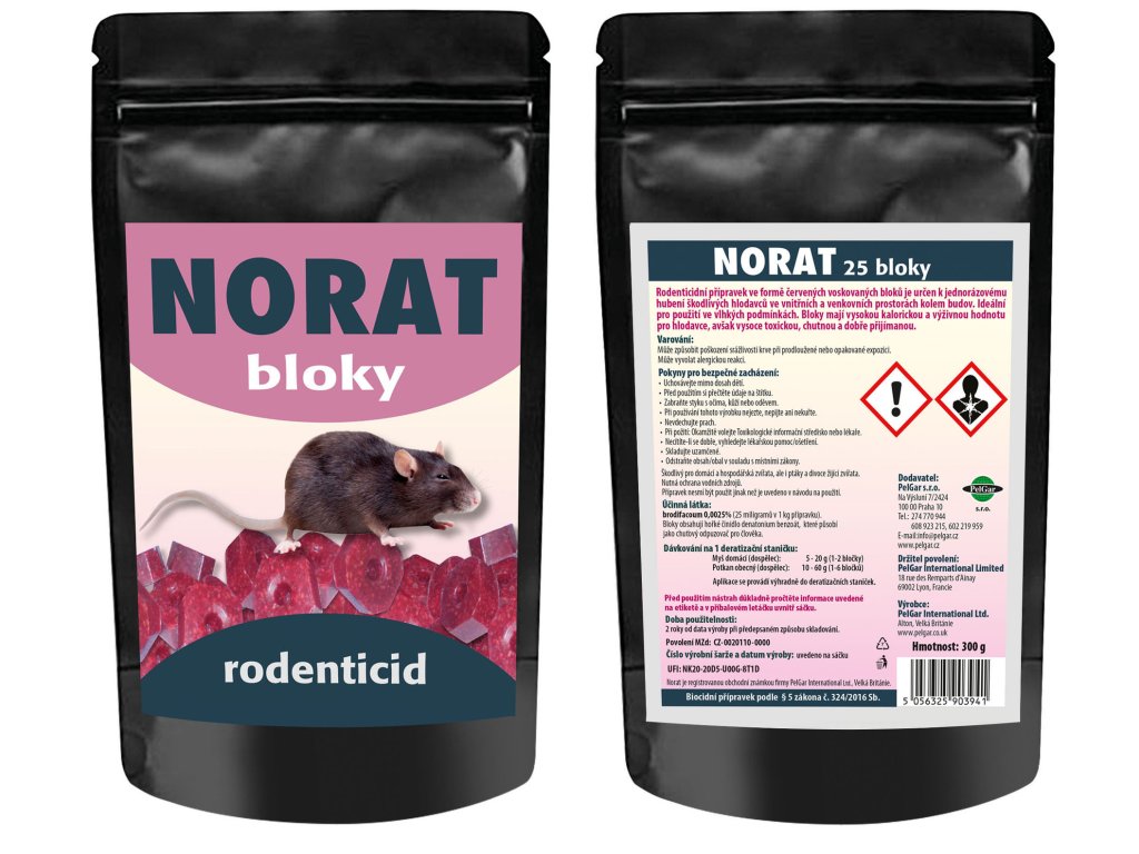 Norat 25 Bloky je červeně zbarvená požerová nástraha ve formě bloků o velikosti cca 2,4 x 2,4 cm k hubení škodlivých hlodavců jako je potkan, myš domácí a krysa ve vnitřních a venkovních prostorách kolem budov. Norat 25 Bloky má vysokou kalorickou a výživnou hodnotu pro hlodavce, avšak vysoce toxickou, chutnou a dobře přijímanou. Nástraha Norat 25 Bloky velice příjemně voní což zvyšuje její konzumaci (palatabilitu). Je hydrofobní a k jejímu rozpadu ve vlhku dochází až po několika dnech, zpravidla po 5 dnech. Parafínový obal totiž zaručuje delší trvanlivost nástrahy i v extrémně vlhkých podmínkách. Norat 25 Bloky obsahuje hořké činidlo, které působí jako chuťový odpuzovač pro člověka.