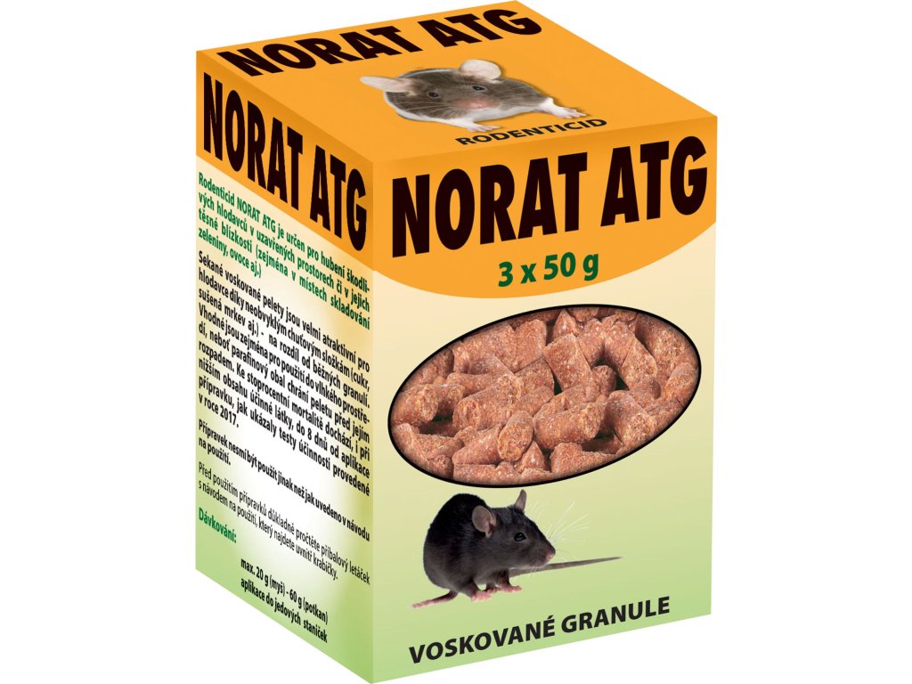 Rodenticid Norat ATG je určen pro hubení škodlivých hlodavců v uzavřených prostorech či v jejich těsné blízkosti. Sekané voskované pelety jsou velmi atraktivní pro hlodavce díky neobvyklým chuťovým složkám ( cukr, sušená mrkev, aj. ) na rozdíl od běžných granulí. Vhodné jsou zejména pro použití do vlhkého prostředí, neboť parafínový obal chrání peletu před jejím rozpadem.