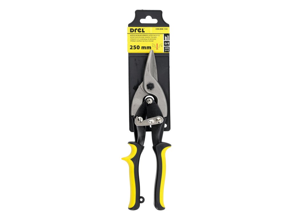Nůžky na plech 250 mm, rovné, DREL. délka: 250 mm Čelisti jsou z chromvanadiové oceli. Plastová ochrana rukojeti je perfektní pro pohodlný úchop. Převodový mechanismus je ideální pro usnadnění námahy při střihu.Doplňkové parametry