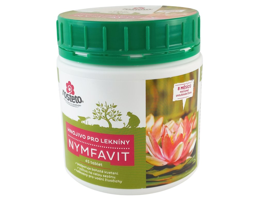 Nymfavit Rosteto je speciální pomalu rozpustné hnojivo v tabletách pro dlouhodobé individuální hnojení a přihnojování leknínů. Hnojivo uvolňuje živiny po dobu až 8mi měsíců. Balení obsahuje cca 45 ks tablet.