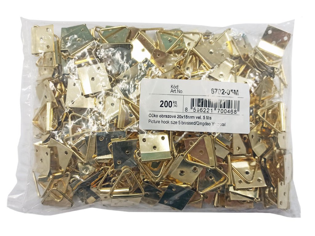 Očko obrazové 20 x 18 mm, velikost 5, Ms (200 ks). rozměry: 20 x 18 mm balení: 200 ks Obrazové očko se používá pro zavěšení a vystavení obrazů či fotografií na zeď. Očko jednoduše přitlučete nahoru na zadní stranu dřevěného rámu.Doplňkové parametry