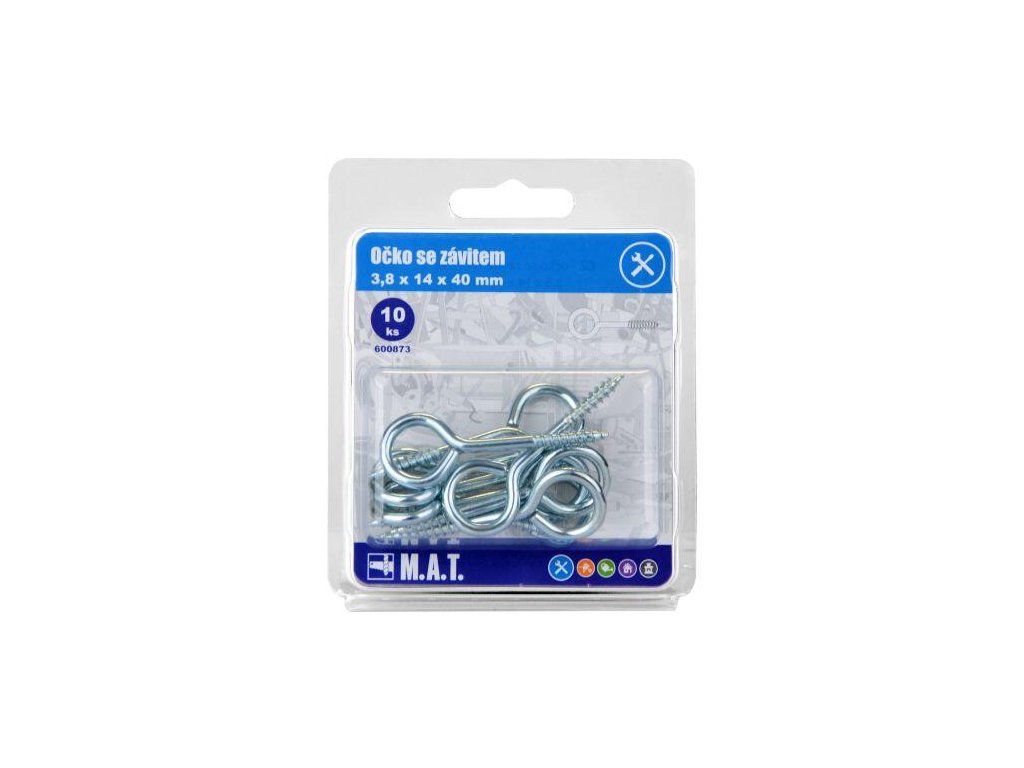 rozměry (D x pr. očka x pr.): 40 x 14 x 3,8 mm materiál: Zn 10 ks Zavřené očko se závitem 40 x 14 x 3,8 mm pro uchycení předmětů a břemen do různých materiálů.Doplňkové parametry