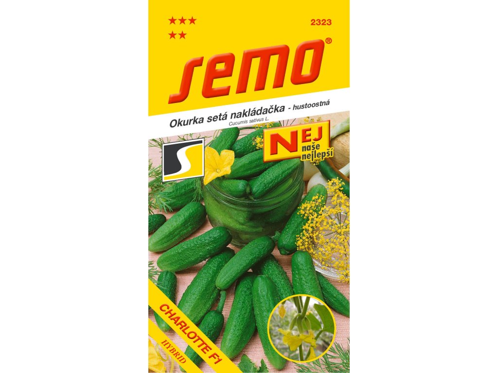 CHARLOTTE F1 (kód 2323) – kolekce NEJ - velmi raná, hustoostná nakládačka s převážně samičím kvetením. Plody jsou štíhlé, delší, tvarově