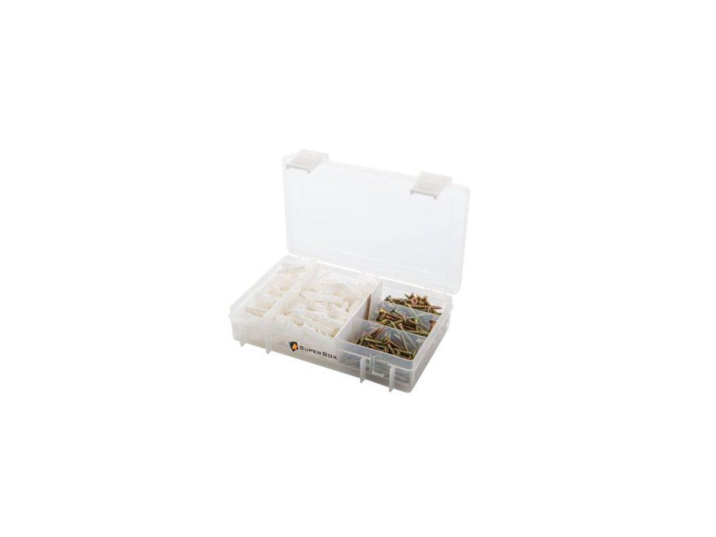 SUPER BOX se spojovacím materiálem č. 2 pro průměr vrtaného otvoru 6 mm. Sada obsahuje: - hmoždinka standardní UPP, polypropylen, barva bílá, 6 x 30 mm (90 ks) - vrut se zápustnou hlavou, křížová drážka, kalená ocel, zinek, 3,5 x 35 mm (120 ks)Doplňkové parametry