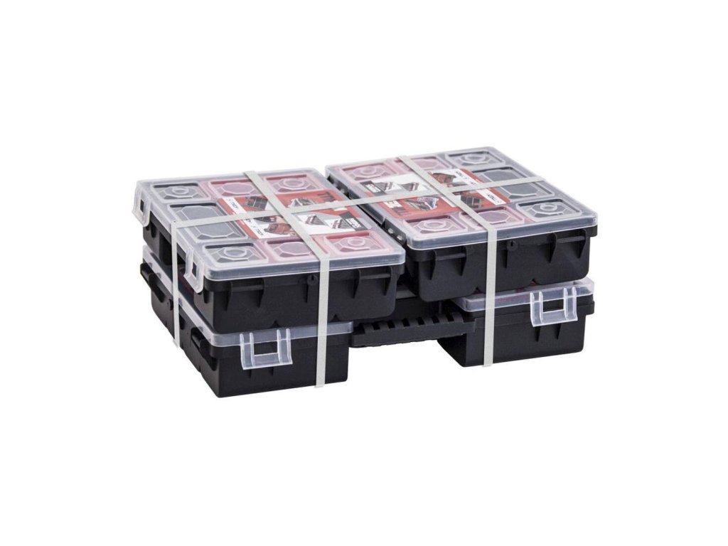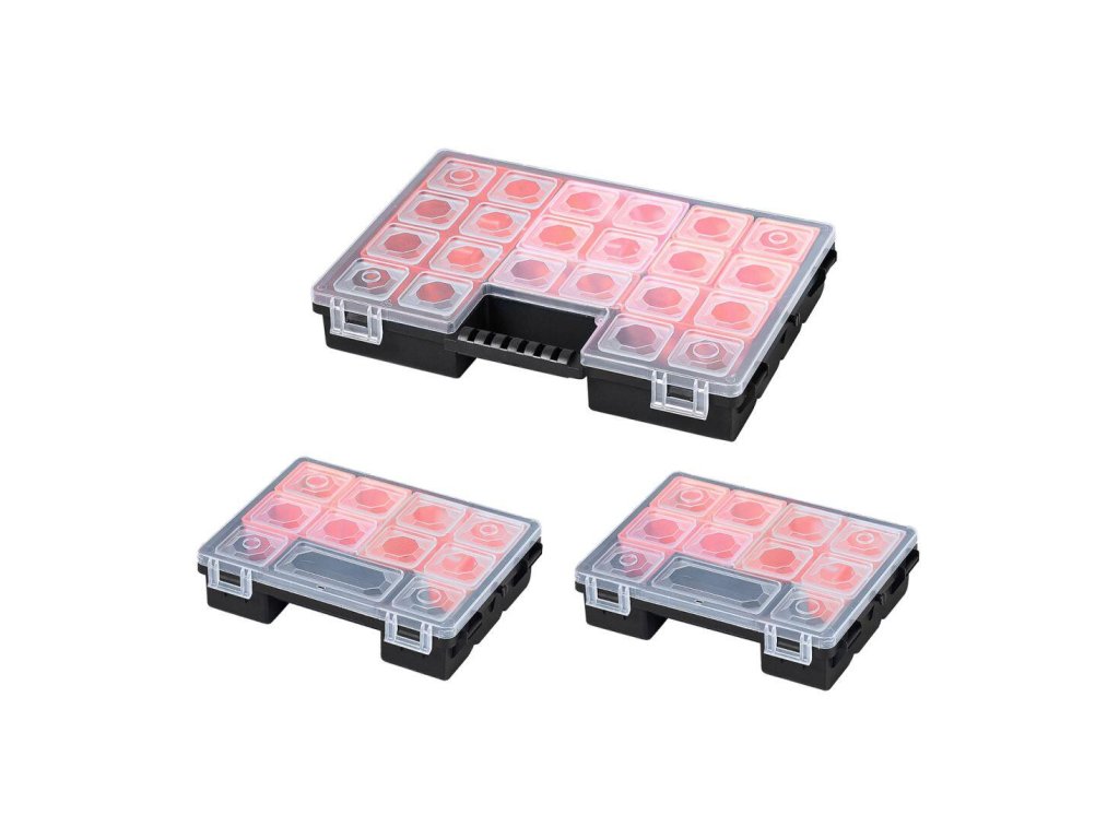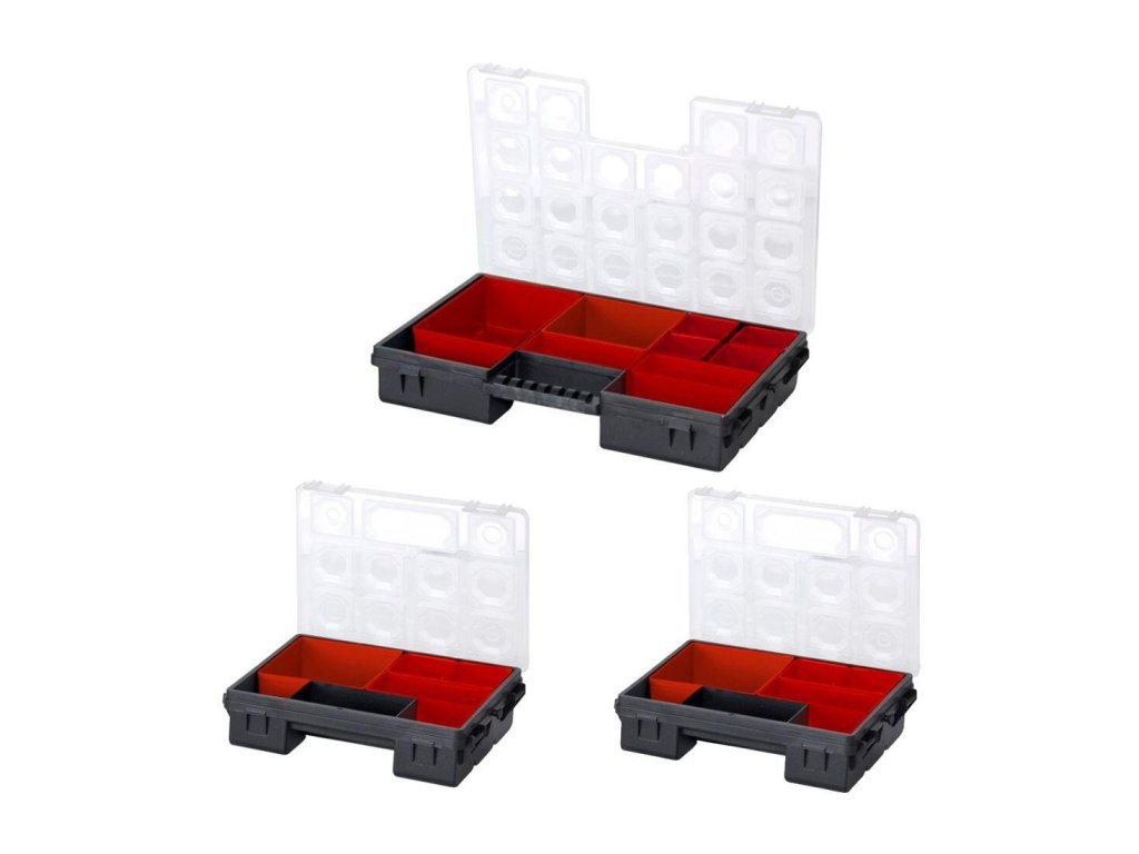 Rozměry setu (Š x V x H): 284 x 100 x 192 mm Rozměry organizéru C200 (Š x V x H): 192 x 50 x 143 mm Rozměry organizéru C300 (Š x V x H): 284 x 50 x 192 mm Set se skládá ze 2 organizérů C200 a 1 organizéru C300. Transparentní víko, uvnitř přihrádky různých velikostí. Organizér nářadí Tandem C 300 + 2 x organizér nářádí Tandem C 200 Tandem C 300: - 8 ks přestavitelných plastových boxů čtyř různých velikostí s průhledným víkem - integrované držadlo - transparentní uzavíratelné víko Tandem C 200: - 4 ks přestavitelných plastových boxů tří různých velikostí s průhledným víkem - integrované držadlo - transparentní uzavíratelné víko - profesionální organizéry z odolného plastu - přestavitelné plastové boxy různých velikostí - polykarbonátové transparentní víko, které vám usnadní přehled nad rozložením dílků v organizéru - exkluzivní design, efektní barevné provedení - odolné plastové provedení Set organizérů nářadí Tandem C 300 a C 200 slouží k přehlednému uložení a jednoduchému přenášení drobného, především spojovacího materiálu, jako jsou šrouby, matice, vruty, hmoždinky, hřebíky, ale i elektronických součástek, apod.Doplňkové parametry