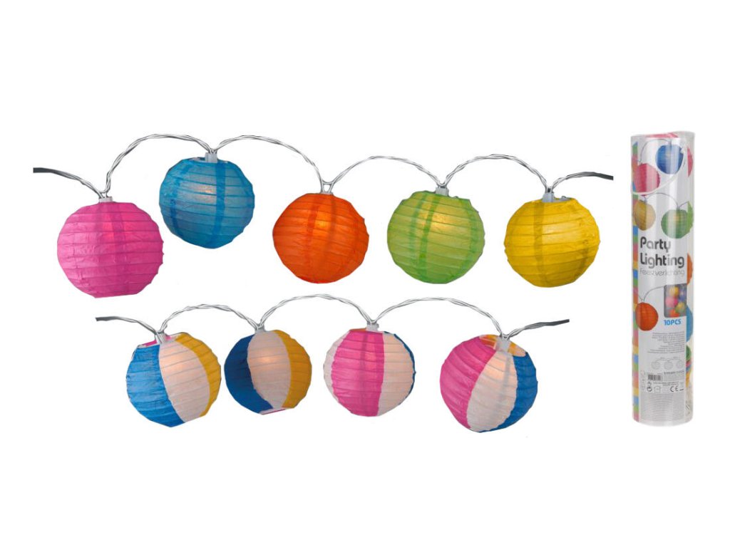 LED osvětlení/dekorace, které vytvoří správnou atmosféru na oslavě, párty, nebo večírku. 10LED LAMPIONY o průměru 10 cm, řetěz 180 cm, rozestupy 20 cm, mix barev. Vypínač. Kabel do zásuvky.Doplňkové parametry