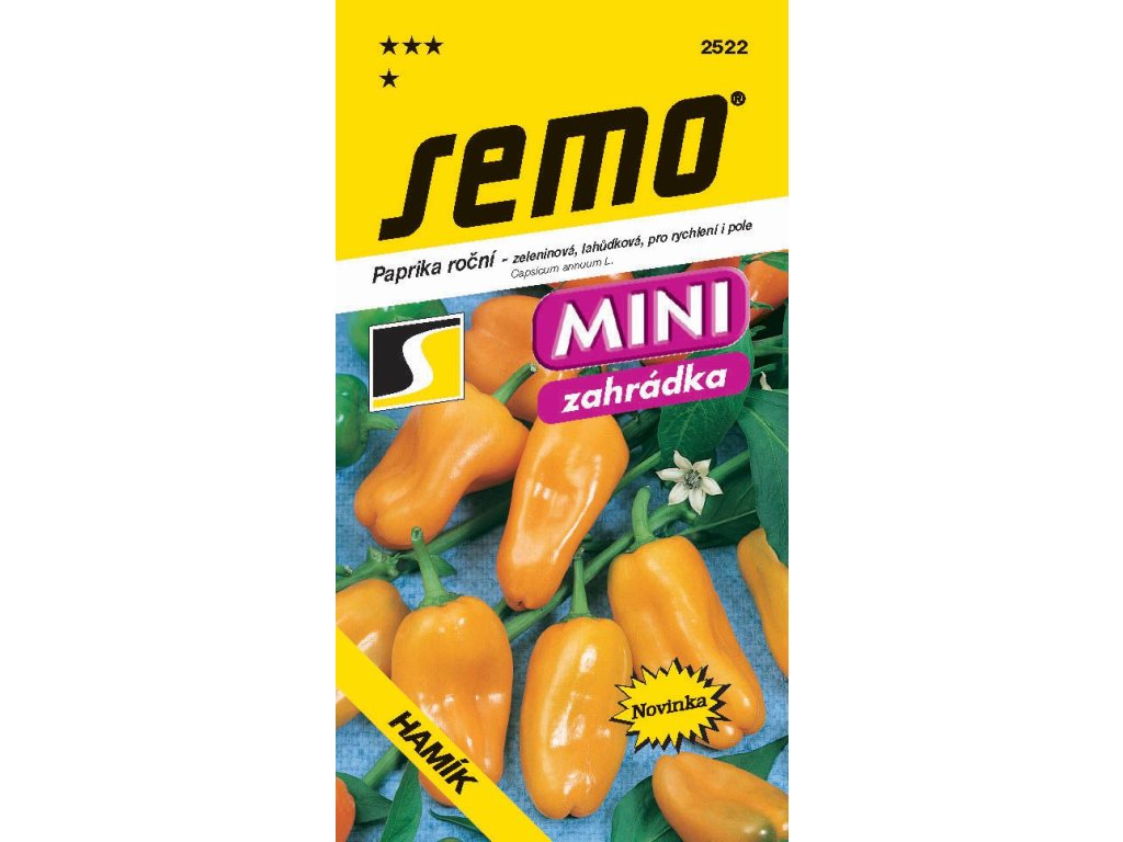HAMÍK (kód 2522) kolekce MINI ZAHRÁDKA – lahůdková „baby“ paprika s menšími, sytě oranžovými plody lahodné chuti. Plody, které jsou téměř bez semen, se konzumují i sterilují celé, zásadně v botanické zralosti. Při dostatečném zásobení živinami poskytují rostliny středního vzrůstu velký počet plodů. V chladnějších oblastech je nutné rychlení, aby většina plodů dozrála do botanické zralosti (sytě oranžová barva). Tuto odrůdu nabízíme také v BIO kvalitě!