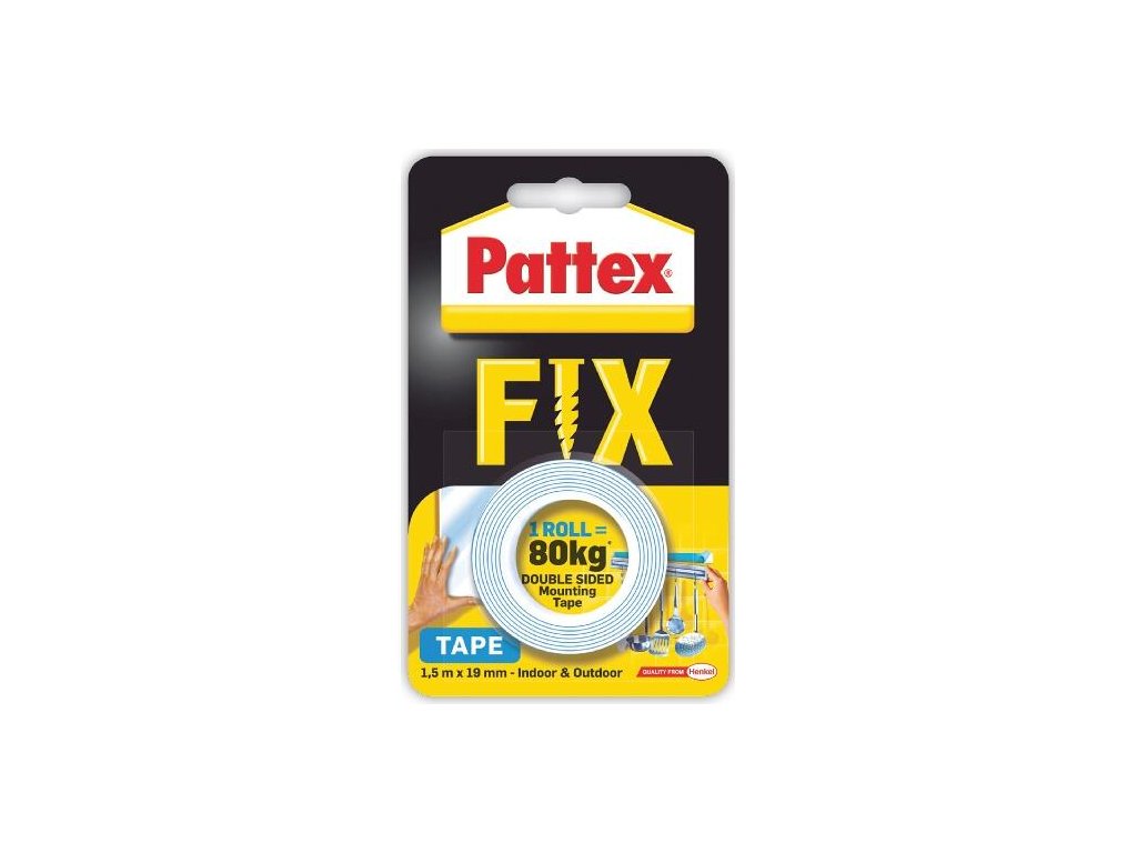 Páska oboustr. 19 mm x 1,5 m 80 kg PATTEX SUPER FIX. rozměry: 19 mm x 1,5 m nosnost: 80 kg Lepicí páska Pattex Fix je vhodná pro použití v interiéru i exteriéru. Udrží až 80 kg a skutečně velmi pevně lepí.Doplňkové parametry