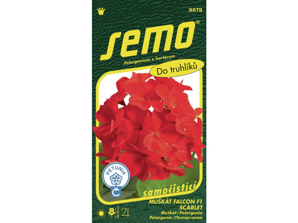 FALCON F1 SCARLET (kód 9878) – revoluční odrůda muškátů pěstovaných ze semen. Rostliny jsou dobře větvené a kompaktní, bez květenství vysoké 25 cm (s květenstvím 35 cm). Květenství jsou pevná, o průměru 10–11 cm. Květy o velikosti asi 4 cm jsou jasně červené. Rostliny výborně snáší jak slunečné polohy, tak i polostín. Vhodné jsou do nádob, závěsných košů i záhonů. Ve velkých výsadbách získáte bohatě kvetoucí záhon, který díky samočistícímu efektu nepřestává kvést.