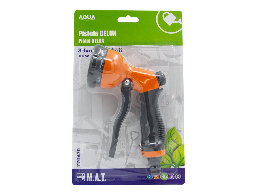 materiál: kov Proudová pistole DELUX je s 8 funkcemi ideálním doplňkem zahradní hadice.Doplňkové parametry