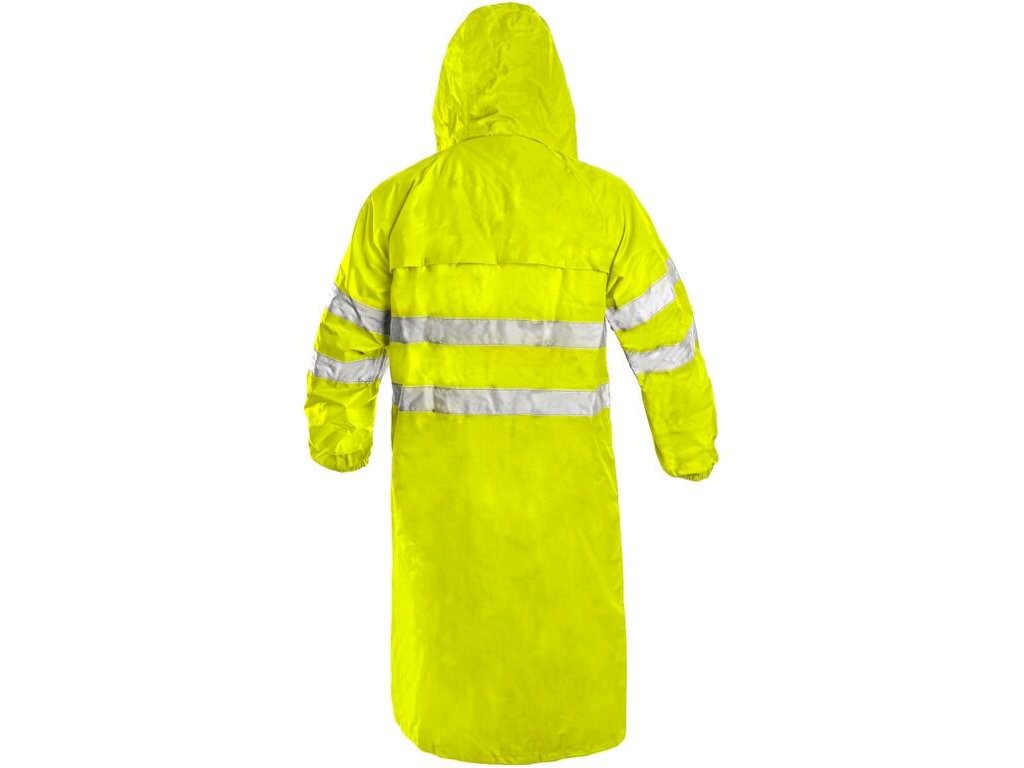 Výstražný plášť s reflexními pruhy, nepromokavý, lepené švy, odepínací kapuce v límci, zapínání na zip krytý légou, raglánové rukávy v manžetě do gumy, dvě spodní kapsy s patkou, větrání na zádech a v podpaží. Plášť je složen v praktickém balení na zip. Délka pláště 120 cm.Doplňkové parametry