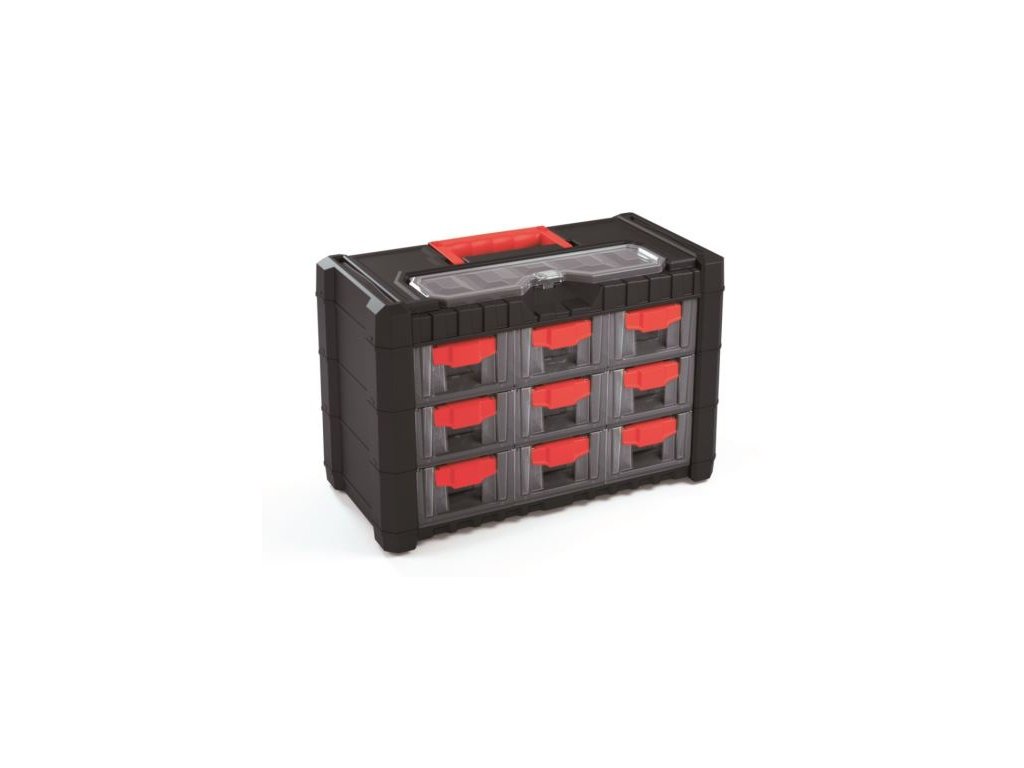 Plastový organizér pro profesionály i kutily, vhodná pro úschovu různého nářadí, ale i pro drobnější věcí jako třeba hřebíky. Organizér schraňuje věci v čistotě a na jednom místě. Poskytne Vám 9 spolehlivých šuplíků. A díky možnosti přenášení, nebo zavěšení je velmi praktický.