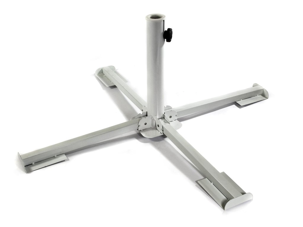 Podstavec pod slunečník, kov. BÍ. rozměry: 85 x 85 x 35 cm vnitřní průměr: 50 mm / 38 mm s plastovou redukcí materiál: kov barva: bílá Skládací kovový stojan, s plastovou vložkou, je vhodný na uchycení zahradního slunečníku, venkovního sušáku, nebo jako stabilní ukotvení zahradního altánu. Stojan je po rozložení vhodné zatížit betonovou dlažbou pro zajištění stability. Dlažba není součástí dodávky, maximální velikost dlaždice pro připravené kovové patky je 40 x 40 cm.Doplňkové parametry