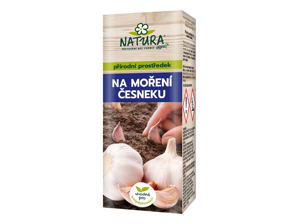 Přípravek NATURA na moření česneku 100 ml. objem: 100 ml Unikátní receptura na bázi přírodních látek, účinná látka (kmínový olej) vytvoří ochranný film, proti háďátkům a půdním houbovým chorobám česneku. Dávkování 50 ml koncentrátu do 1 l vody - moření stroužků před vysadbou do půdy (5 hod). Možné použít i na cibulky okrasných rostlin před výsadbou, vhodný ekologické zemědělství. Používejte přípravky na ochranu rostlin bezpečně. Před použitím si vždy přečtěte označení a informace o přípravku.Doplňkové parametry