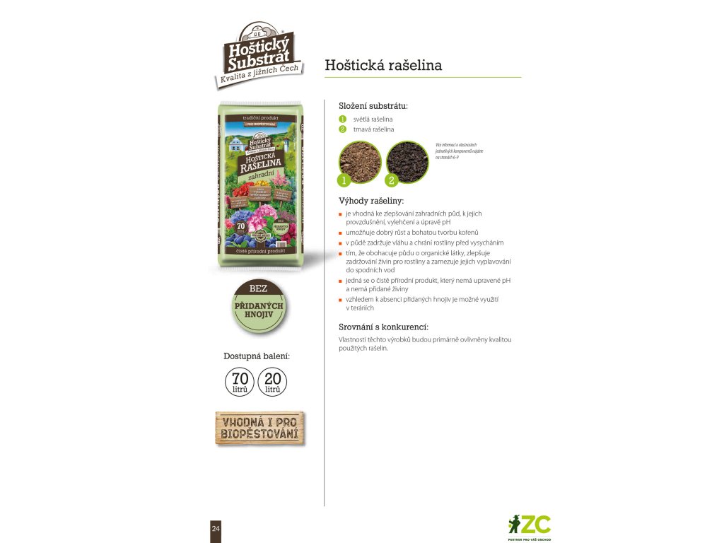 HOŠTICKÁ RAŠELINA ZAHRADNÍ je směs vytříděné světlé a tmavé rašeliny. Hoštická rašelina zahradní má všestranné využití v zahradnictví, lesnictví i v zemědělství. Je vhodná ke zlepšování zahradních půd, k jejich provzdušnění, vylehčení a úpravě pH. Umožňuje dobrý růst a bohatou tvorbu kořenů. V půdě zadržuje vláhu a chrání rostliny před vysycháním. Tím, že obohacuje půdu o organické látky, zlepšuje zadržování živin pro rostliny a zamezuje jejich vyplavování do spodních vod. Rašelina je čistě přírodní produkt, nemá upraveno pH a nemá přidané živiny.