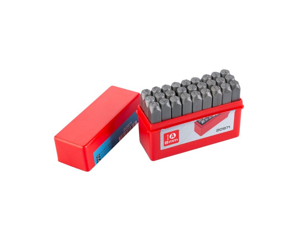 Ruční raznice - písmena abecedy, kvalitní uhlíková ocel - pevnost do 800 N/mm2, zakalené hroty - vysoká tvrdost, rozměry : výška písmen - 8 mm, balení: plastový box.Doplňkové parametry