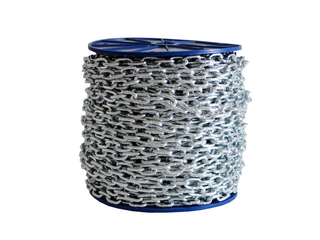 délka: 60 m síla řetězu: 3,90 mm rozměr článku: 19 mm x 8,2 mm maximální zatížení: 204 kg Krátkočlánkový řetěz je vysoce odolný a využitelný převážně v exteriéru.Doplňkové parametry