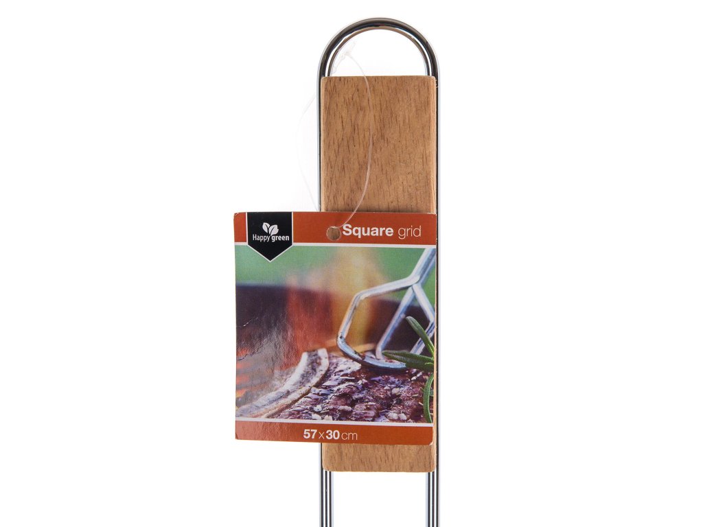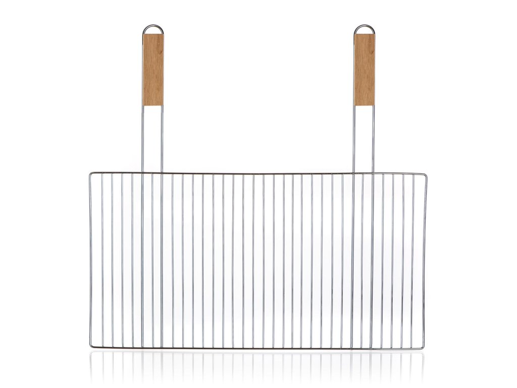 Rošt grilovací BBQ 57 x 30 cm. rozměry: 57 x 30 cm materiál: ocel, dřevo Hranatý grilovací rošt BBQ s dřevěnými rukojeťmi využijete pro snadné grilování masa, zeleniny apod. Je vhodný také pro zděné zahradní grily. Rošt je vyroben z pochromované oceli, počet drátů na roštu je 34 kusů.Doplňkové parametry