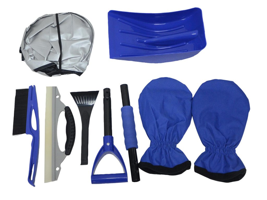 Zimní sada do auta 6dílná. - 1 ks plastová lopata na sníh, celková délka 81,50 cm, šířka 17 x 29 cm, 2 oddělené železné trubky - 1 ks smetáček na sníh 40,5 x 9 cm - 1 ks škrabka na led - 1 pár rukavic - 1 ks TPR stěrka na okna, 30 x 9,5 cm - 1 ks sněhová clona, 200 x 70 cm, 190T polyester S touto zimní sadou do auta budete na příchod zimy opravdu připraveni. Obsahuje sněhovou clonu, která ochrání vaše přední sklo od sněhu a námrazy, smetáček s rukojetí, pomocí kterého odstraníte přebytečný sníh a škrabku na námrazu a led. Díky rukavicím, které jsou součástí sady, už nikdy nebudete mít prokřehlé a zmrzlé prsty. Lopatu využijete na horách nebo na parkovišti k odhrabání čerstvého sněhu po noční sněhové nadílce.Doplňkové parametry