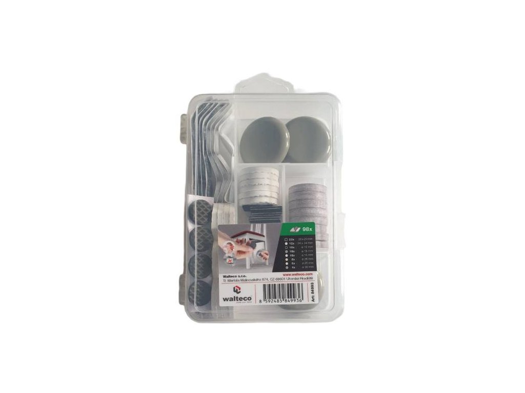 - Filcové podložky: 20x20 mm černá - 20x, Ø 15 mm šedá - 16 ks, Ø 15 mm bílá - 16 ks, Ø 25 mm béžová - 8 ks