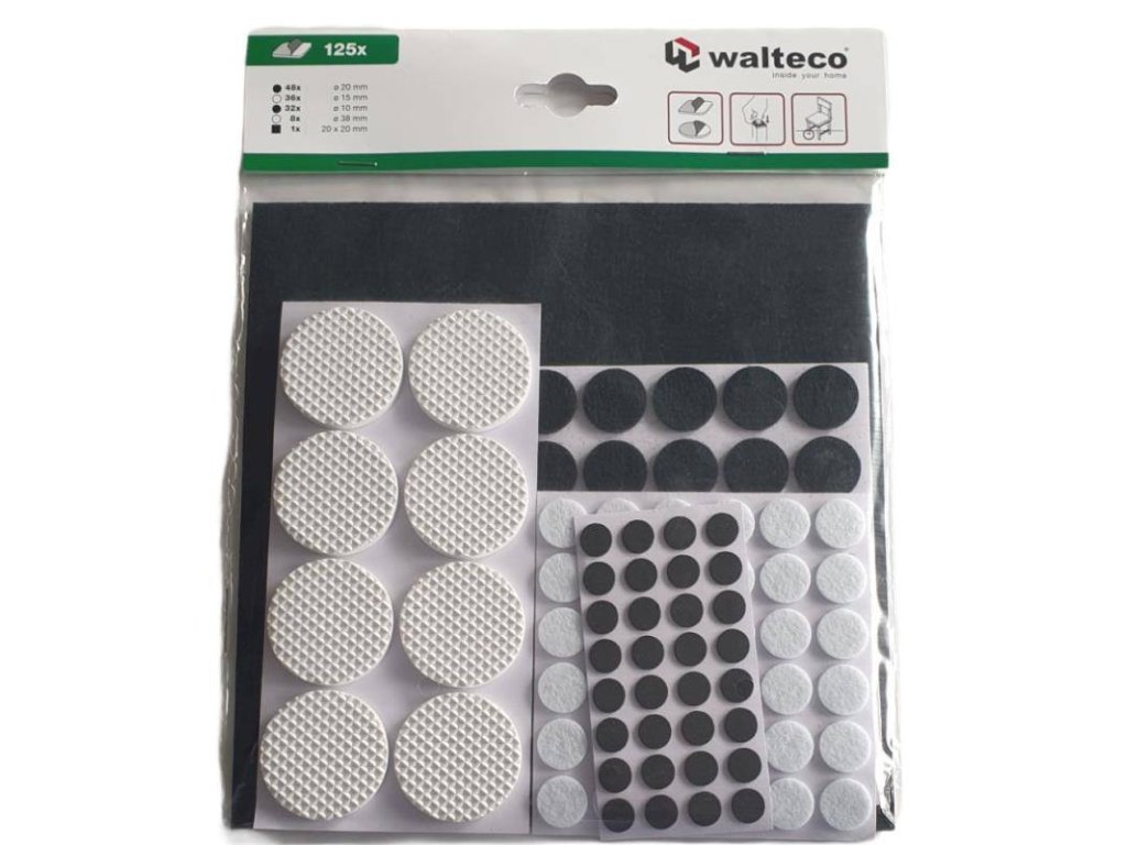 - Filcové podložky: 200x200 mm černá - 1x, O 20 mm černá - 48x, O 15 mm bílá - 36x