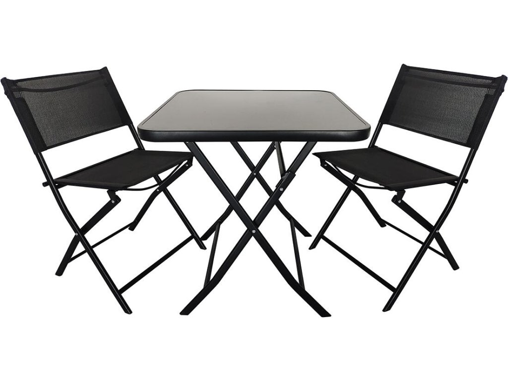 Set zahradní ocel / textilén / sklo, stůl + 2 židle, ČER. - skládací kavárenský set obsahuje 1 stůl + 2 židle - rozměry židle: 46 x 56 x 85 cm, ocelový rám: 28 x 14 mm, 20 x 12 mm - výplet židlí z Textilénu 1 x 1 - prodyšný, omyvatelný materiál, který zajistí příjemné posezení - rozměry stolu: 60 x 60 cm, výška 70 cm, ocelový rám: 28 x 14 mm Skládací sestava vhodná na balkon, menší terasu nebo do zahradní kavárny. Snadná údržba - k čištění povrchu stolu a židlí použijte mokrý hadřík nebo utěrku. Nikdy nečistěte abrasivními čisticími prostředky a drátěnkami, abyste neporušili práškový antikorozní nátěr. V zimě nebo když zahradní nábytek nepoužíváte delší dobu, uskladněte set do vnitřních prostor. nosnost židle: 120 kg nosnost stolu: 50 kgDoplňkové parametry