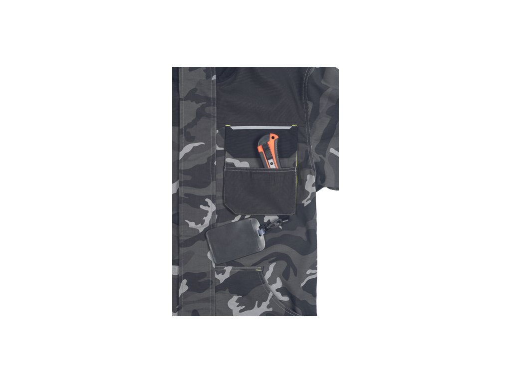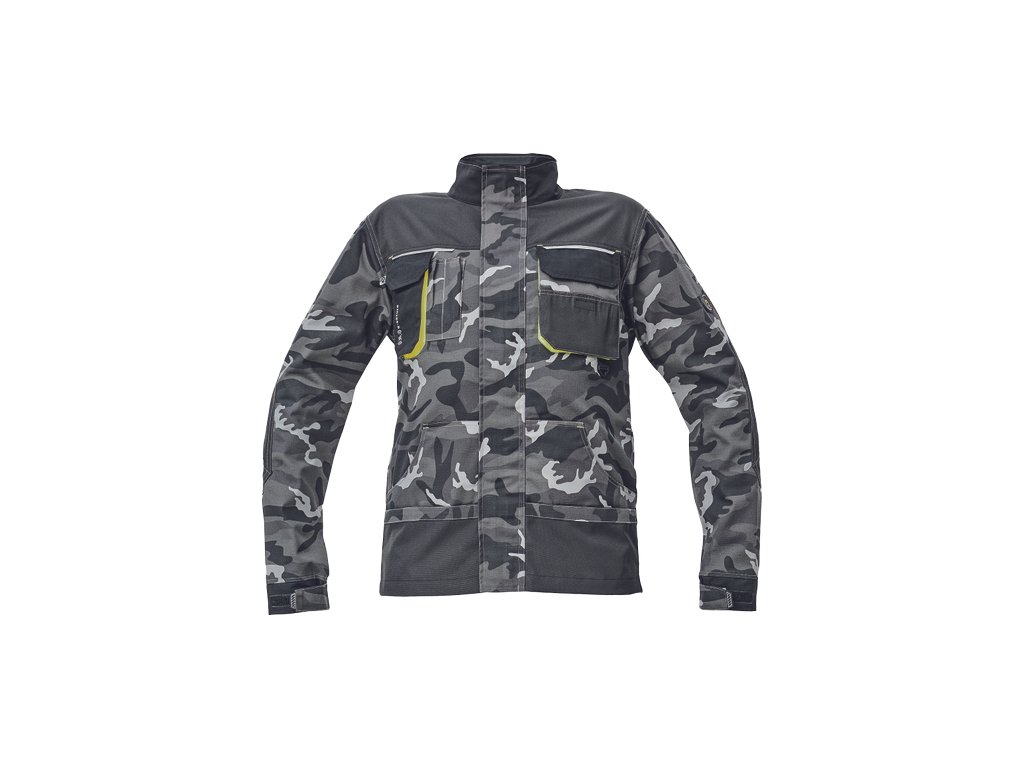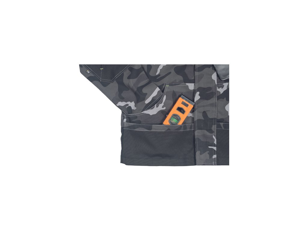 • pánská pracovní bunda • zapínání kryté légou na suchý zip • v moderní úpravě šedé kamuflážové barvy • 2 přední kapsy • 2 náprsní kapsy • 1 náprsní kapsa na mobilní telefon • Oxford 600D zesílení loktů • reflexní prvky • kontrastní prošitíDoplňkové parametry