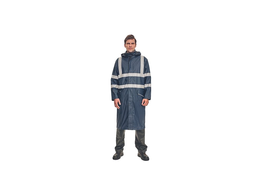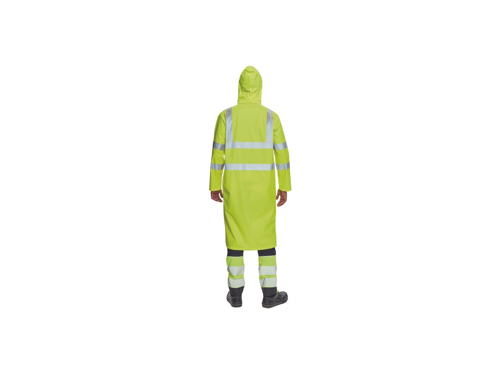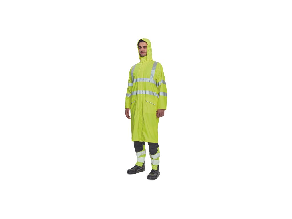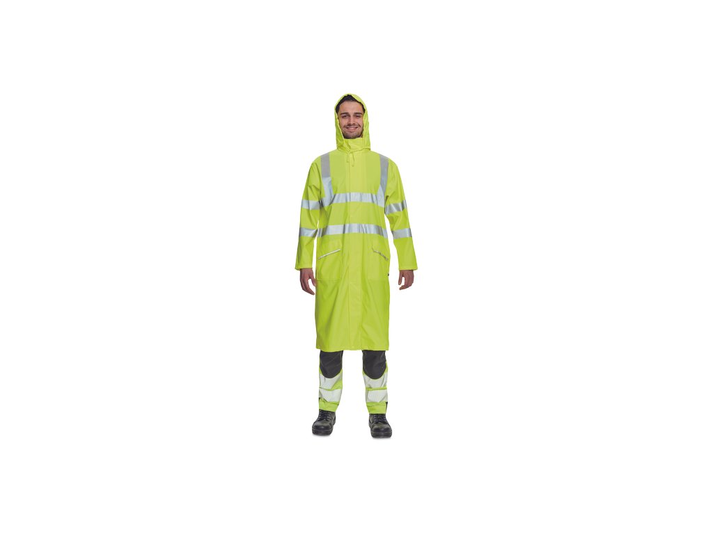 • nepromokavý a větruodolný prodloužený plášť s kapucí v límci, délka 120 cm • zapínání na oboustranný zip krytý légou s druky • reflexní pruhy po obvodu pasu, boků, rukávů a přes ramena • obvod kapuce lze stáhnout na tkaničku • dvě přední kapsy kryté légami s reflexní paspulí pro zvýšení viditelnosti • spodní lem rukávů lze upravit drukem • EN 20471 ISO: Třída 3 je v HI-VIS provedení ve žluté a oranžové barvěDoplňkové parametry