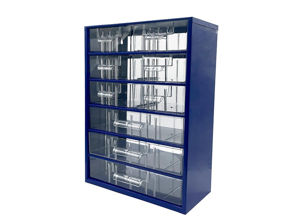 Skříňka 2 velikosti, 6 středních, 3 velké zásuvky, 30,5 x 46 x 15,5 cm, kov. MO. rozměry: 30,5 x 46 x 15,5 cm 6 středních zásuvek 3 velké zásuvky materiál: kov barva: modrá Kovové organizéry TOKOZ jsou ideálním řešením pro přehledné a bezpečné uložení drobného materiálu, součástek i nářadí. Díky robustní konstrukci a čirým zásuvkám nabízejí dlouhou životnost a snadnou orientaci. Hlavní přednosti: - pevný korpus z ocelového plechu s odolným práškovým lakem - čiré plastové zásuvky s možností doplnění přepážek - variabilní instalace - volně stojící, stohovatelné, k zavěšení na zeď - modulární systém – možnost kombinace různých velikostí zásuvek - plynulé vysouvání a stop systém proti vypadnutí - vhodné do dílen, garáží i výrobních provozůDoplňkové parametry