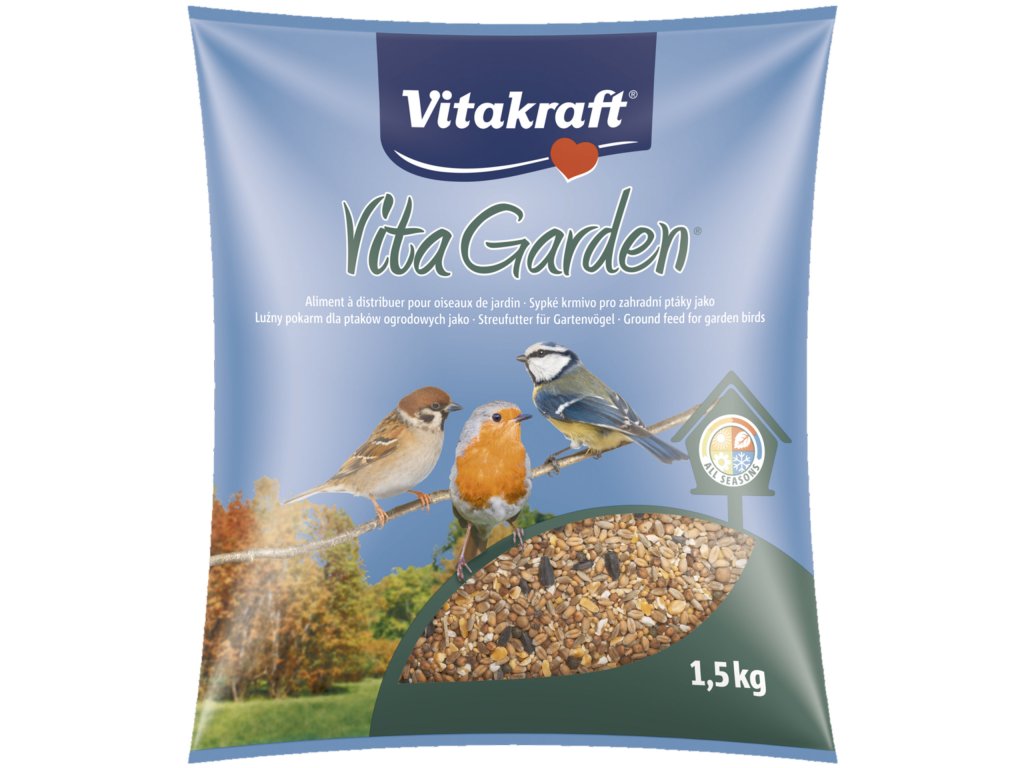 Kompletní krmivo pro zahradní ptactvo. Krmivo Vita Garden obsahuje lahodná semena, obilná zrna, slunečnicová semínka a vitamíny. Je cenným doplňkem stravy volně žijících zahradních ptáků. Vynikající celoroční krmivo pro mnoho ptačích druhů. Perfektní do krmítek nebo na rozsypání po zemi. Receptura bez cukru. Neobsahuje umělá barviva ani konzervační látky.
