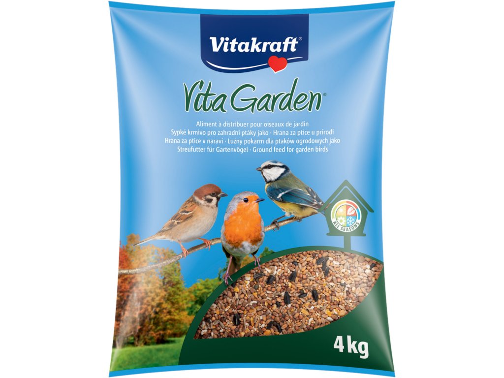 Kompletní krmivo pro zahradní ptactvo. Krmivo Vita Garden obsahuje lahodná semena, obilná zrna, slunečnicová semínka a vitamíny. Je cenným doplňkem stravy volně žijících zahradních ptáků. Vynikající celoroční krmivo pro mnoho ptačích druhů. Perfektní do krmítek nebo na rozsypání po zemi. Receptura bez cukru. Neobsahuje umělá barviva ani konzervační látky.
