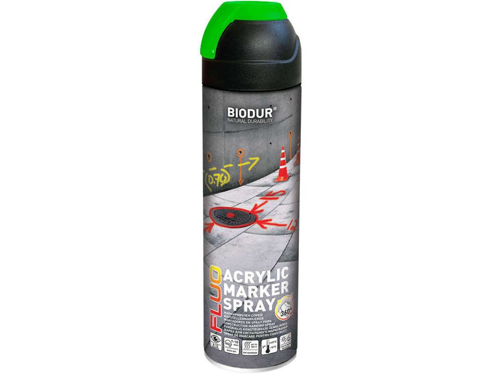 Akrylátová fluorescenční barva s vysokým jasem pro profesionální značení na stavbách obytných a průmyslových objektů. Sprej je vhodný na použití při jakékoli fázi oprav a výstavby silnic. Dále se často používá v dřevozpracujícím průmyslu. Další využití může být v: geodézii a topografii, v hornictví, na průmyslových polích, při sportovních soutěžích a mnoho dalších. Sprej je dobře viditelný na asfaltu, betonu, na cihlách, v hlíně, písku, n atrávě, dřevu, skle, kovu a dalších površích. Ergonomická čepice umožňuje používat při práci se sprejem rukavice a nezašpinit si ruce. Ke stříkání spreje je vhodné použít palec. Barva rychle schne, cca okolo 7-10 minut. Doba schnutí ale samozřejmě závisí na typu povrchu, okolní teplotě a vlhkosti.