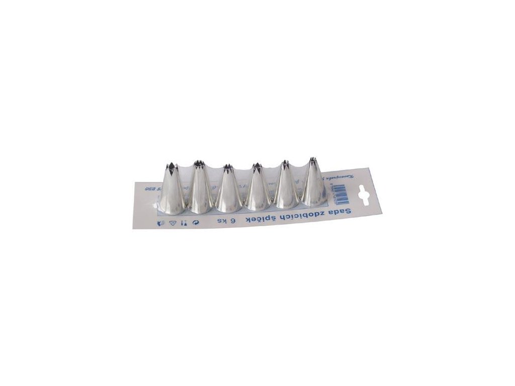 špička zdobicí sada 6díl. pocín. materiál: pocínovaný kov baleni: 6 ks Sada zdobících špiček vhodná na zdobení dortů, zákusků, případně pomazánek.Doplňkové parametry