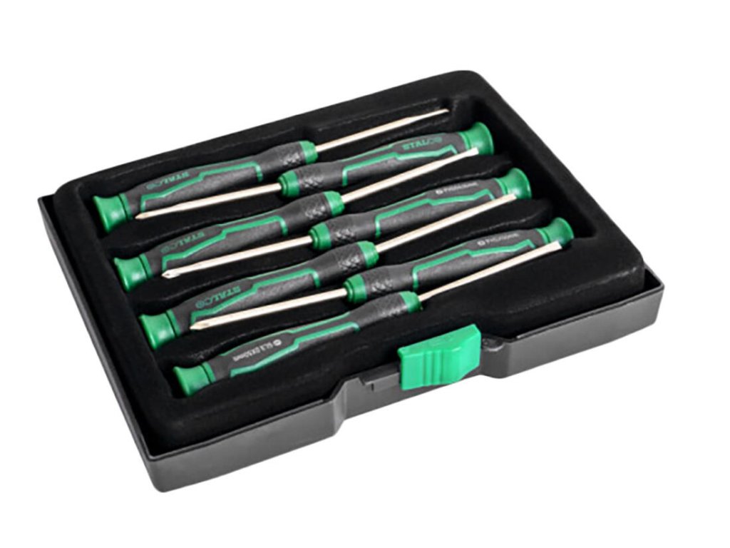 Šroubovák jemný, sada 7díl. STALCO. sada obsahuje ploché šroubováky: - 1,5 x 50 - 2,0 x 50 - 2,5 x 50 - 3,0 x 50 - PH000 x 50 - PH00 x 50 - PH0 x 50 7dílná sada přesných šroubováků.Doplňkové parametry