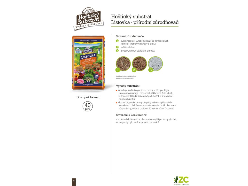 - Listovka obsahuje kvalitní organickou hmotu a díky použitým surovinám obsahuje i nižší obsah základních živin (dusík, fosfor a draslík) i další živiny (vápník, hořčík a síru) včetně stopových prvků.