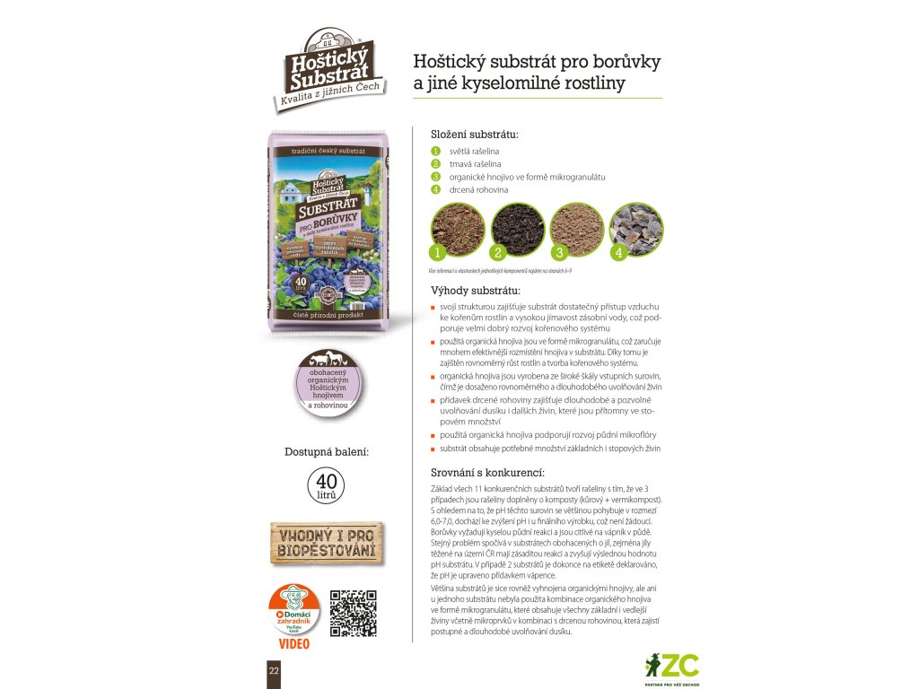 HOŠTICKÝ SUBSTRÁT PRO BORŮVKY je vyroben ze směsi světlé a tmavé rašeliny s vhodnou kyselostí. K vyhnojení substrátu je použita kombinace organických hnojiv ve formě mikrogranulátu spolu s drcenou rohovinou. Substrát neobsahuje minerální (průmyslová) hnojiva.