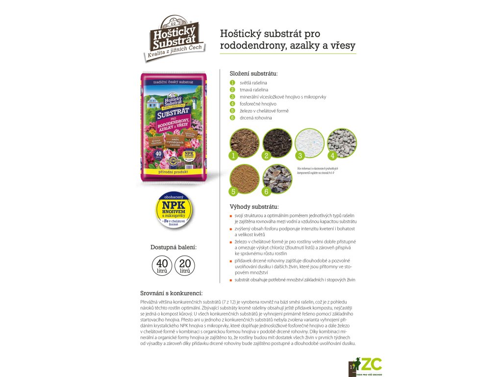 HOŠTICKÝ SUBSTRÁT PRO RODODENDRONY, AZALKY A VŘESY je vyroben ze směsi vytříděné světlé a tmavé rašeliny s vhodnou kyselostí. K základnímu vyhnojení substrátu je použito minerální vícesložkového hnojivo s mikroprvky. Substrát je dále obohacen o fosforečné hnojivo a železo v chelátové formě. Kromě minerálních hnojiv je k vyhnojení substrátu použito i organické hnojivo v podobě drcené rohoviny.