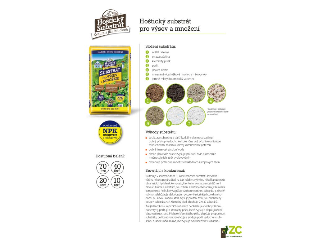 SUBSTRÁT je určen speciálně pro výsevy a množení rostlin. Je vyroben ze směsi vytříděné světlé a tmavé rašeliny, prosetého jemně tříděného křemičitého písku, perlitu, přírodní jílovité složky a minerálního vícesložkového hnojiva s mikroprvky. Půdní reakce je upravena jemně mletým dolomitickým vápencem.
