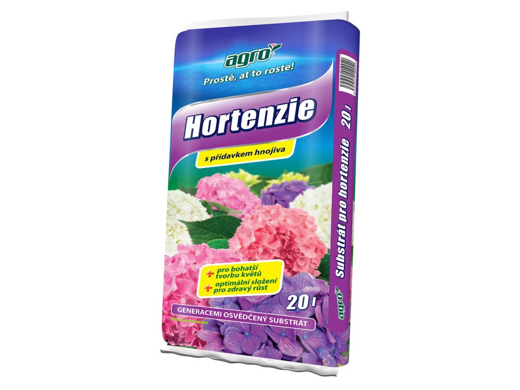 Substrát pro hortenzie 20 l AGRO. objem: 20 l AGRO Substrát pro hortenzie je určen pro všechny druhy hortenzií (latnaté, velkolisté apod.). Obsahuje kvalitní rašelinu, kůrový kompost, vápenec pro úpravu pH a hnojivo na prvních 6 týdnů růstu. Substrát není vhodný pro modré hortenzie. V tomto substrátu se jim vrací přirozená růžová či červená barva. Pro modré hortenzie použijte kyselý AGRO substrát pro rododendrony a azalky nebo AGRO substrát pro borůvky a brusinky a přihnojujte pravidelně FLORIA hnojivem pro modré hortenzie.Doplňkové parametry