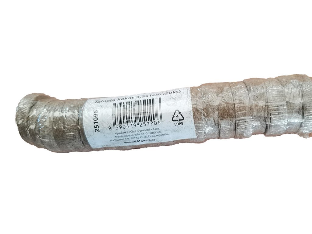 Tableta kokos 3,5 x 1 cm (20 ks). rozměry: 3,5 x 1 cm balení: 20 ks - balení dvaceti tablet 100% kokosové rašeliny - rozměr tablety je 3,5 x 1cm - kokosovou rašelinu připravíte tak, že zalijete tabletu malým množstvím vlažné vody a necháte ji několik minut nabobtnat Kokosové tablety vhodné pro předpěstování rostlinek ze semínka nebo řízků bez potřeby rašelinového substrátu.Doplňkové parametry