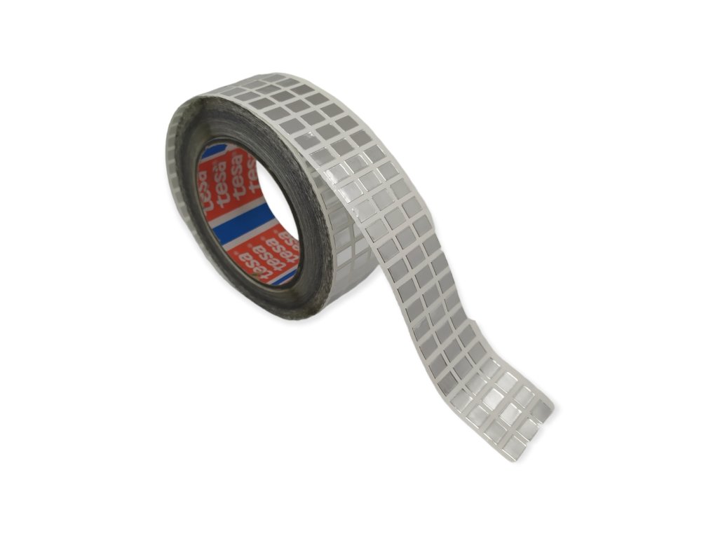 Výsek obdélníku ze silné hliníkové 50µm TESA pásky 54565. TESA 50565 je silná hliníková páska na bázi 50µm hliníkové fólie a akrylového lepidla. Používá se především v průmyslu spotřebičů a také pro širokou škálu dalších aplikací. Výrobní verze PV1 se dodává s papírovou vložkou.Výsek má rozměr 7x10mm. Celkem je na jednom kotouči 10.000ks výseku