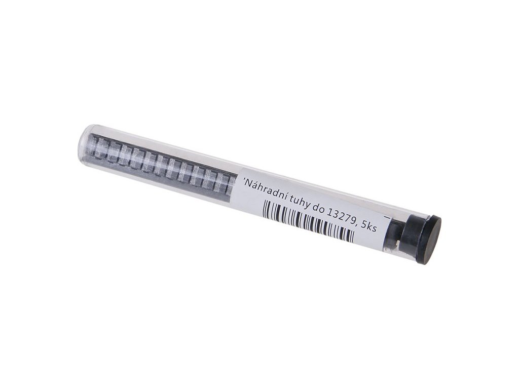 Tuha je dělena na segmenty o délce cca 5 mm, které se po otupení odlomí a je opět ostrý hrot. Klasická tvrdost tuhy - HB. Ochranný plastový tubus s 5 kusy náhradních tuh.Doplňkové parametry