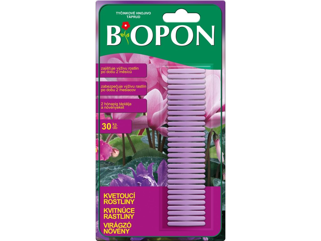 Hnojivové tyčinky Biopon pro kvetoucí rostliny dodávají živiny po dobu 2 měsíců. Snadno vstřebatelné hnojivo odráží spotřebu kvetoucích rostlin na živiny. Každá tyčinka obsahuje přiměřené množství kompozice fosforu a draslíku. Stimuluje rostliny k vytváření poupat, díky čemuž intenzivně kvetou.