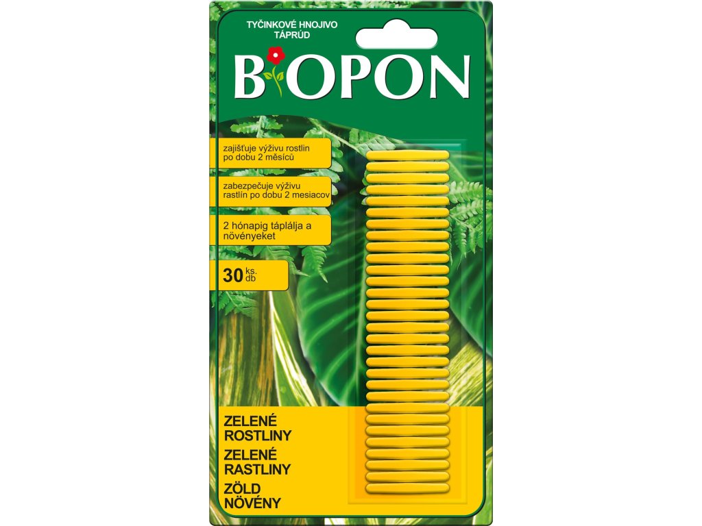Hnojivové tyčinky Biopon pro zelené rostliny dodávají živiny po dobu 2 měsíců. Koncentrované hnojivo ve formě tyčinek pro pohodlné používání. Stačí umístit tyčinku do květináče a aktivuje se uvolňování minerálních složek nezbytných pro pravidelný růst zelených rostlin. Přiměřený obsah fosforu a draslíku rostlinám zaručuje optimální podmínky pro rozvoj.